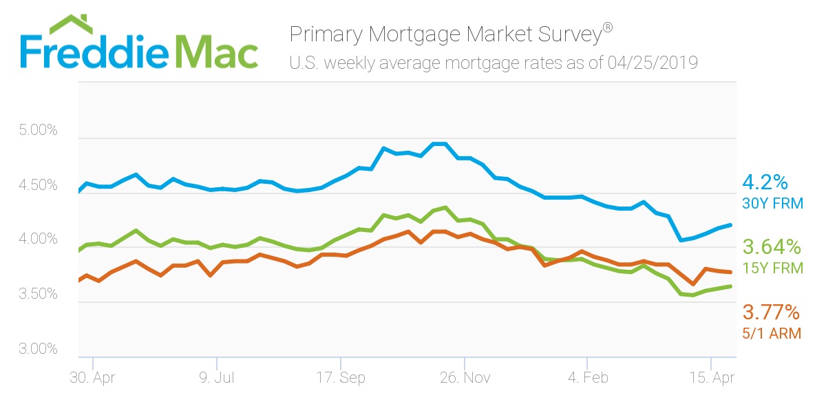 - 30-year fixed-rate mortgage (FRM) averaged 4.20 percent with an average 0.5 point for the week ending April 25, 2019, up from last week when it averaged 4.17 percent. A year ago at this time, the 30-year FRM averaged 4.58 percent.
