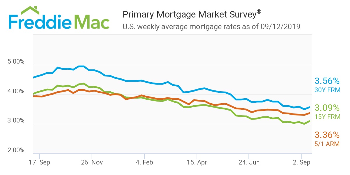 MCLEAN, Va., Sept. 12, 2019 (GLOBE NEWSWIRE) -- Freddie Mac (OTCQB: FMCC) today released the results of its Primary Mortgage Market® (PMMS®), showing that the 30-year fixed-rate mortgage (FRM) rate averaged 3.56 percent. While this is an increase from last week, this is the first time 30-year fixed mortgage rates have been under 3.6 percent over four consecutive weeks since the fourth quarter of 2016.