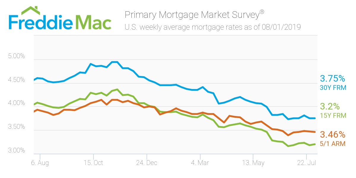 MCLEAN, Va., Aug. 01, 2019 (GLOBE NEWSWIRE) -- Freddie Mac (OTCQB: FMCC) today released the results of its Primary Mortgage Market Survey® (PMMS®), showing that the 30-year fixed-rate mortgage rate sat at 3.75 percent.